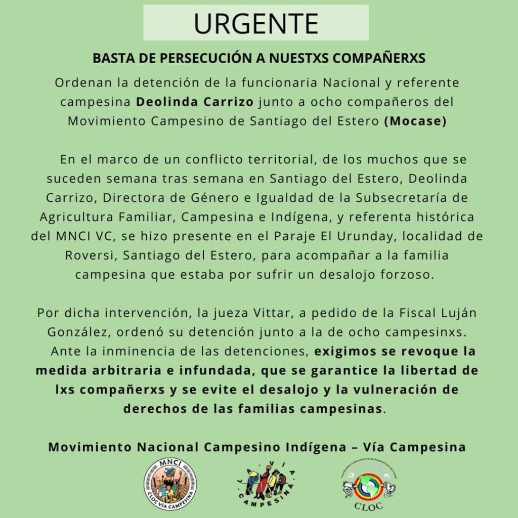En el marco de un conflicto territorial de Santiago del Estero, en función de sus atribuciones como funcionaria otorgados por la Ley 27.118 de Reparación Histórica de la Agricultura Familiar, Deolinda se hizo presente en el paraje El Urunday, localidad de Roversi, para acompañar a una familia que estaba sufriendo un desalojo. Producto de su intervención, la justicia decidió solicitar su detención junto a otras y otros referentes que sostienen la lucha cotidiana por el cumplimiento de los Derechos Económicos, Sociales y Culturales de los pueblos indígenas y campesinos. Exigimos a la justicia de la provincia la revocación de esa medida arbitraria y que se garantice la libertad plena de todas las personas detenidas pertenecientes al Movimiento Campesino de Santiago del Estero.