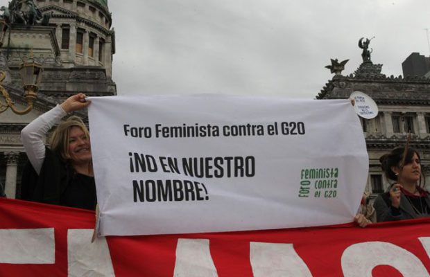 El foro feminista contra el G20 surge a partir de un trabajo colectivo que comenzó a raíz del Primer Foro Feminista frente al Libre Comercio en el marco de la undécima Conferencia Ministerial de la Organización Mundial de Comercio (OMC) en diciembre de 2017 en Argentina. En aquel momento se redactó un documento en el que se expresa que tanto el G20 como la OMC y todos los Tratados de Libre Comercio sólo reflejan la red de lucro de las empresas transnacionales.